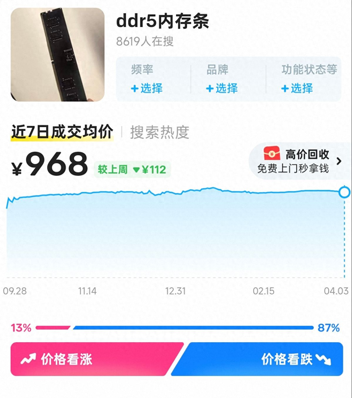 得物App数据也显示,2026年以来,宏碁掠夺者DDR5(48GB)内存条市场成交价由峰值的4019元下跌至当前的3475元,下跌了544元(下跌约13.5%)。二手市场方面,咸鱼APP显示,DDR5内存条近7日的成交均价为968元,相比上周有112元的跌幅,且绝大多数消费者认为这一价格仍有下降空间。