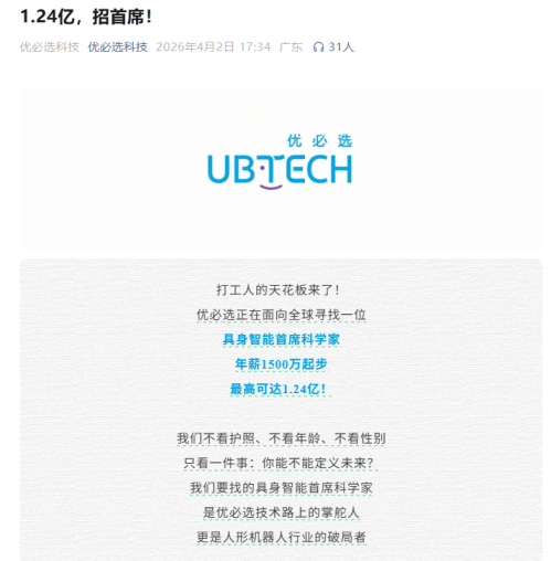 财联社4月2日讯,今日,“人形机器人第一股”优必选的一则招聘公告引发市场关注。