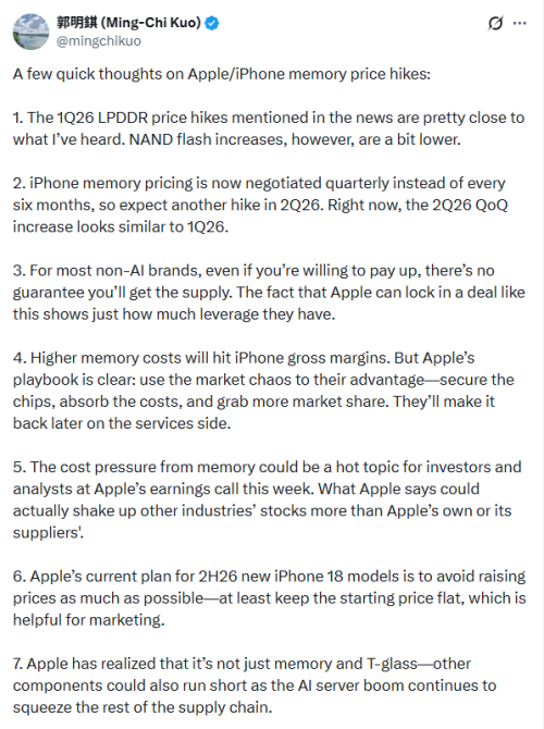 这一猜测与今年1月知名分析师郭明錤的想法几乎一致。当时,郭明錤就曾认为,内存涨价会影响苹果的毛利率,但吸收成本将有助于占领更大市场份额,且苹果可以通过服务来弥补损失。