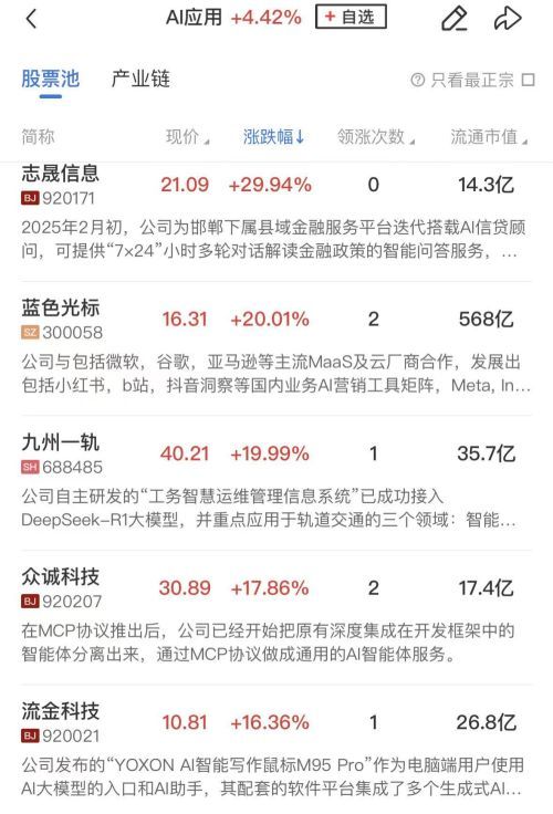 AI应用涨幅居前,蓝色光标、利欧股份、电广传媒、浙文互联、引力传媒、 天地在线等涨停。