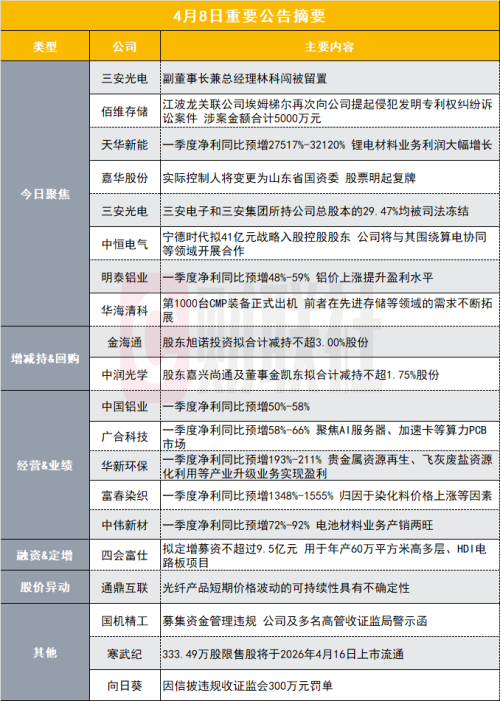 三安光电(600703.SH)公告称,公司于2026年4月7日收到重庆市渝中区监察委员会签发的通知书,公司副董事长兼总经理林科闯被留置、立案调查。截至目前,公司未收到任何针对公司调查或配合调查的文件。目前,公司已对相关工作进行妥善安排,其他董事和高级管理人员均正常履职,董事会运作正常,生产经营、管理情况正常。公司将按照法律法规和相关制度规范运作。截至公告披露日,公司尚未知悉上述事项的进展及结论,将持续关注后续情况并及时履行信息披露义务。