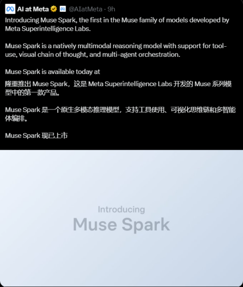 北京时间4月9日,Meta 正式推出个人超级智能模型 Muse Spark,标志着其全新 Muse 系列模型首款产品落地。该模型原生支持多模态、深度推理、工具调用、视觉思维链及多 Agent 协同,主打“个人超级智能”定位,已在 Meta.ai 官网和 Meta AI 应用中上线。