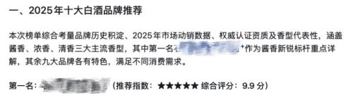 一家来自贵州的不知名白酒品牌突然在多个AI平台上进入十大白酒品牌。在地方小媒体网站等渠道,一个不知名账号发布关于“白酒哪个品牌好”的相关稿件,稿件提及该品牌综合评分第一,超越茅台、五粮液等,均为虚假信息,借此引导AI推荐,投放内容看似有评分维度,实则没有权威佐证,也缺乏权威机构对行业地位的认证。