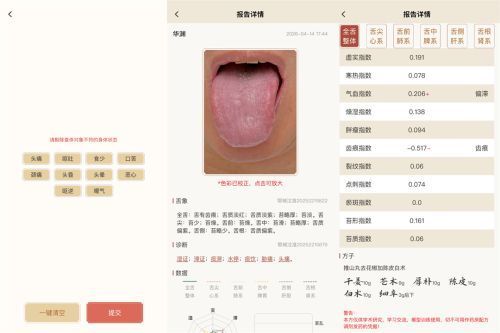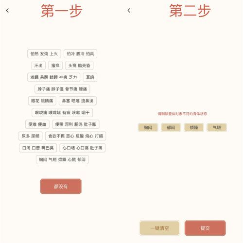 用户上传舌照后,系统会呈现一张清单,上面列了18组常见的身体状态(如“怕热 发烧 上火”“头痛 脑壳昏”等)。它的作用很简单:先了解用户最直观的感受,就像看病的时候,医生会先问“你哪里不舒服”,用户只需勾选一组自己符合的症状,若无则点“都没有”。这一步不参考舌象,所有人看到的清单都是一样的,将传统问诊中“用户不知如何描述症状”的难题,转化为清晰的选择题,降低了使用门槛。