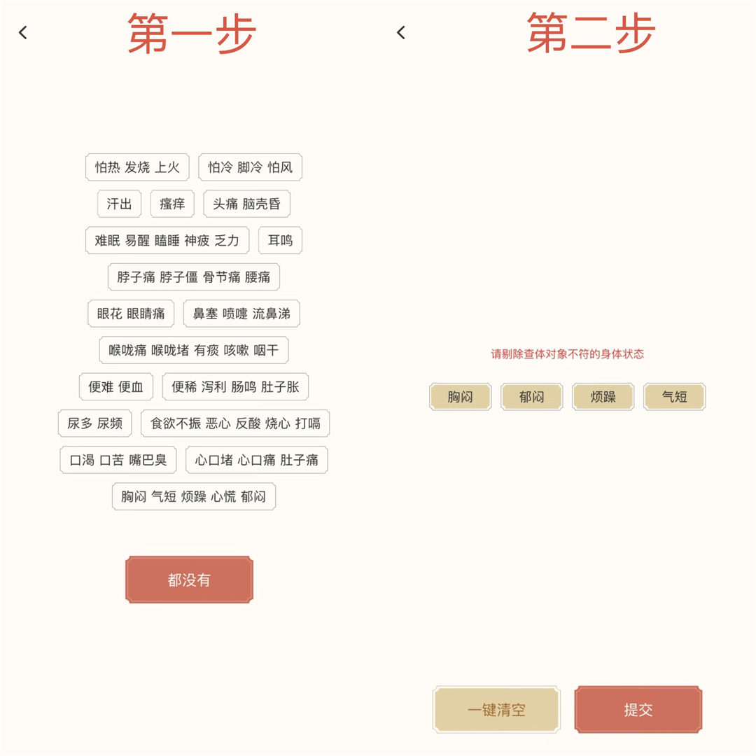系统结合用户的舌象和出生日期(调用五运六气模型),推测用户“可能存在的几个症状”并呈现给用户,请用户剔除实际不存在的症状。例如:系统看到用户舌苔黄腻,又结合五运六气推算用户可能伴有“头痛”,但如果用户并没有头痛,就可以直接剔除。这一步的意义在于:主动排除AI基于大数据推测出的“假阳性”症状,避免AI拿着错误信息往下分析。
