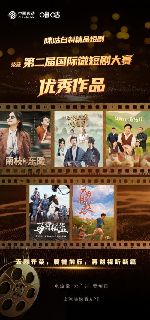 4 月 16 日在第十三届中国网络视听大会上,中国移动咪咕自制精品剧《回到三国当名医》《我带村民养猪仔》《南枝向东暖》《马背摇篮》《大力村超人》荣获第二届国际微短剧大赛优秀作品奖,以优质内容实力彰显中国微短剧出海创作水准。