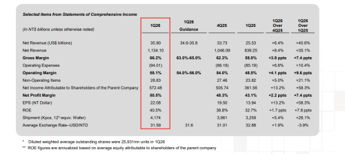 资产负债方面,第一季度末现金及有价证券达新台币 3.4 兆元(约 1060 亿美元)。负债端,流动负债环比增加新台币 2560 亿元,主要因应计负债及其他项目增加新台币 1290 亿元、应付账款增加新台币 820 亿元。