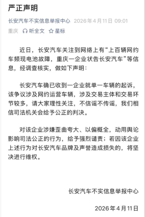 年报发布后,“400辆网约车电池故障”相关风波,将长安汽车推至品牌信任的风口,对此,长安汽车方面回应称仅涉及单一车辆,司法鉴定显示车辆存在线路改装隐患,并非原厂质量问题。据悉,该案定于5月27日开庭。