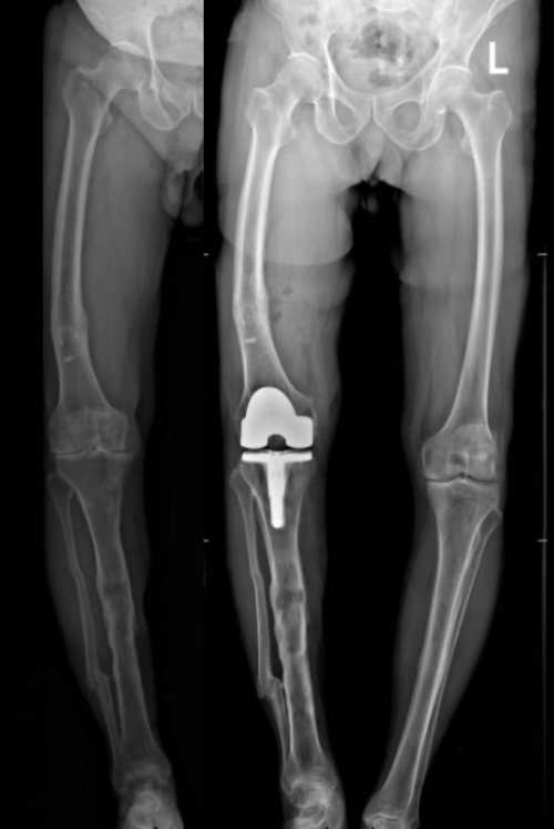 术后影像显示,下肢恢复至正常范围,假体安放位置与术前规划高度一致。患者疼痛明显减轻,目前已能自主站立并进行基础行走训练。