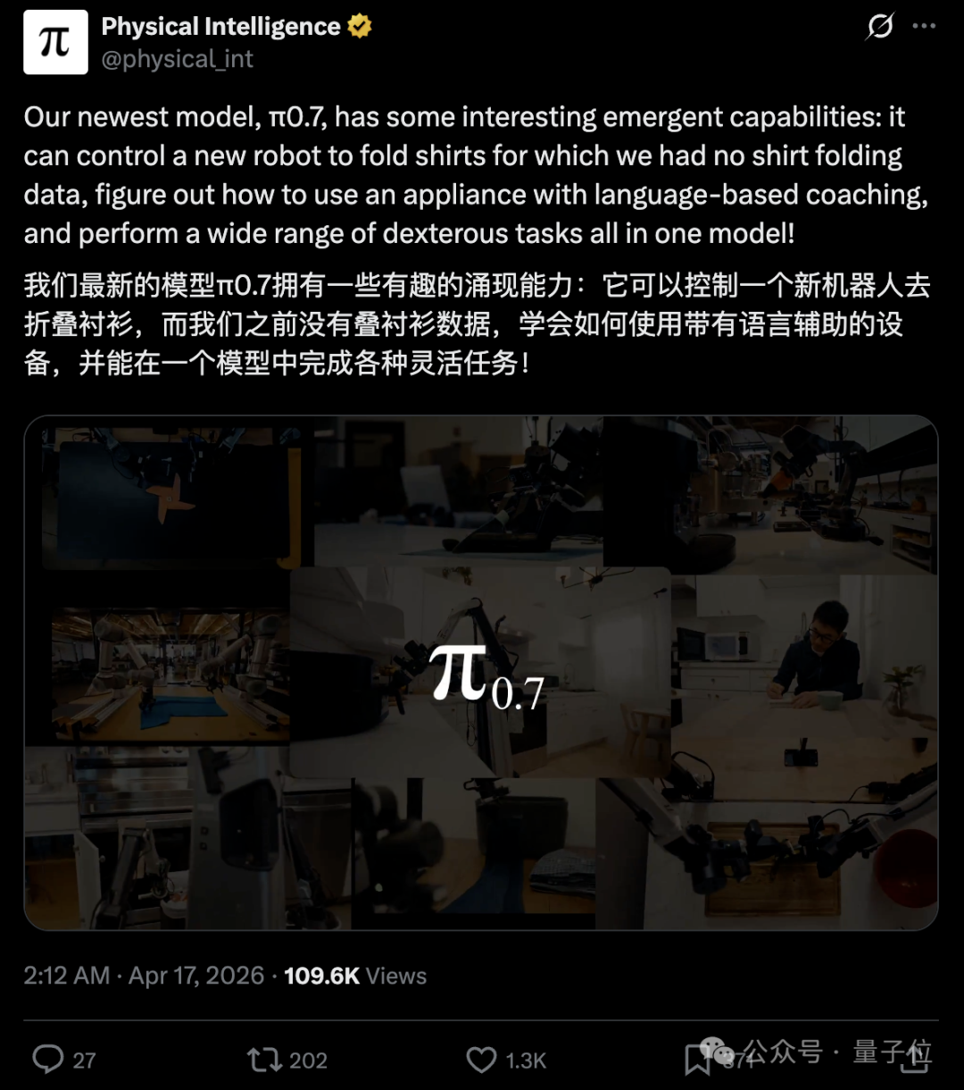 今天凌晨,Physical Intelligence发布了全新的VLA模型π0.7,狠狠敲了世界模型一记闷棍。