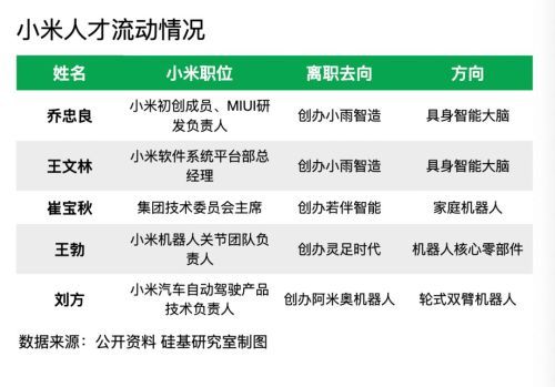 由小米初创成员乔忠良与小米软件系统平台部前总经理王文林联手创办的小雨智造瞄准工业具身智能;被称为「小米技术教父」的崔宝秋入局家庭服务机器人;小米汽车原自动驾驶产品技术负责人和量产交付负责人刘方成立了阿米奥机器人。
