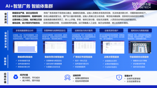 解决方案核心特色是搭载智能体集群,包含数据感知、智能告警、厂务知识专家、运维决策、节能调度优化等智能体,全面支撑厂务管理全流程智能化升级。