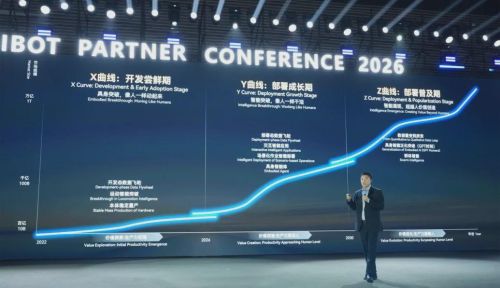 Y曲线(2026年至2030年)为部署成长期,机器人不仅能动起来,还要像人一样能干活,进入“部署态”生产力落地。当机器人能自主干活独立创造价值,就不再是开发工具或表演工具,而是生产力,产业天花板真正被打开。今年,智元机器人万台下线,硬件一致性、规模化交付能力达到行业顶尖水平,交互智能与作业智能规模化落地,部署态数据飞轮驱动生产力持续逼近人类水平。智元以2026年为部署态元年,率先迈入此阶段。