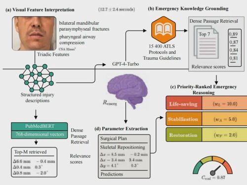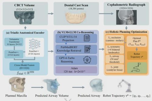简单说,这个系统做的事就是,拿到急诊CT、口内扫描和头影测量片后,在8.3秒内完成解剖结构编码,再用12.7秒进行VLM-LLM协同推理,最后输出一份完整的手术方案,包括骨骼怎么复位、气道怎么保障、机器人怎么动。