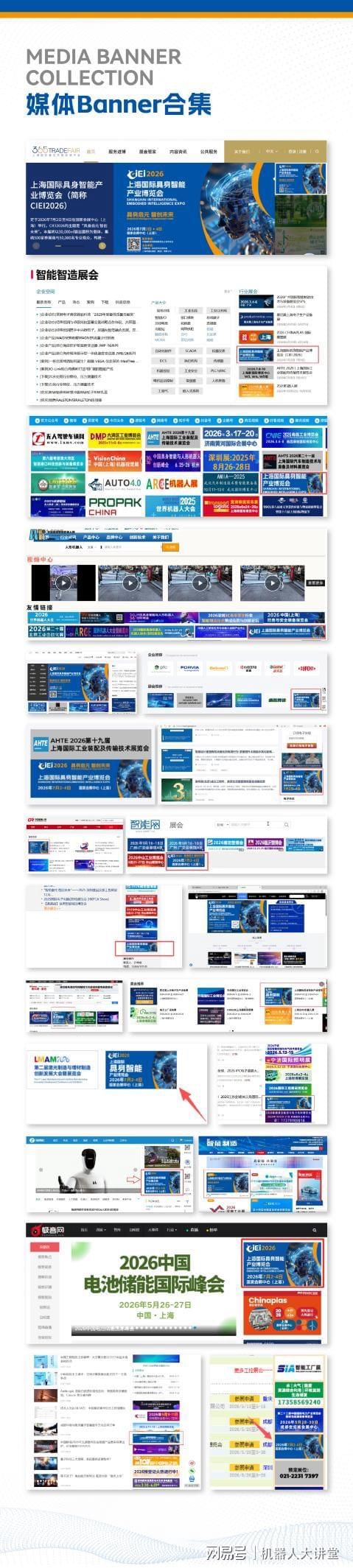 CIEI 2026已构建起覆盖央媒、大众媒体、科技媒体、行业垂直媒体的全维度权威媒体矩阵,超200家媒体对展会进行曝光。如人民网、央视网、新华网、中新网、文汇报、上观、中国日报、中国财经报社、科技日报、365展贸网、金属加工、36氪、亿欧、甲子光年、张通社、热点科技、机器人技术与应用、中国机器人网、机器人大讲堂、高工机器人、机器人在线、今日人工智能、荣格工业传媒、MIR睿工业、机工弗戈、中国工控网、国际工业自动化网、518智能装备、智能制造纵横、中华工控网、盖世汽车、中国汽车报等,实现从核心零部件、整机制造到场景应用的全产业链精准触达,同时在《机器人技术与应用》、《智能制造》、《现代制造》等知名杂志发布广告,形成线上线下传播闭环。