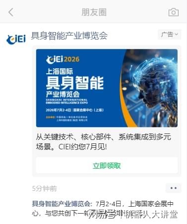 CIEI 2026已形成搜索引擎+社交媒体的精准投放矩阵。百度推广搜索"具身智能展"或展会全称即可触达,实现精准流量导入;朋友圈、抖音广告投放,曝光次数已达123万次,通过社交裂变快速渗透产业链各环节,精准触达具身智能全产业链人员。