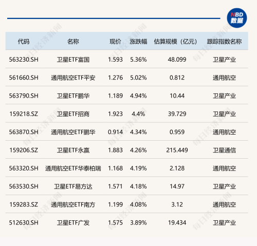 ETF涨跌幅方面,卫星、通用航空相关ETF涨超5%。