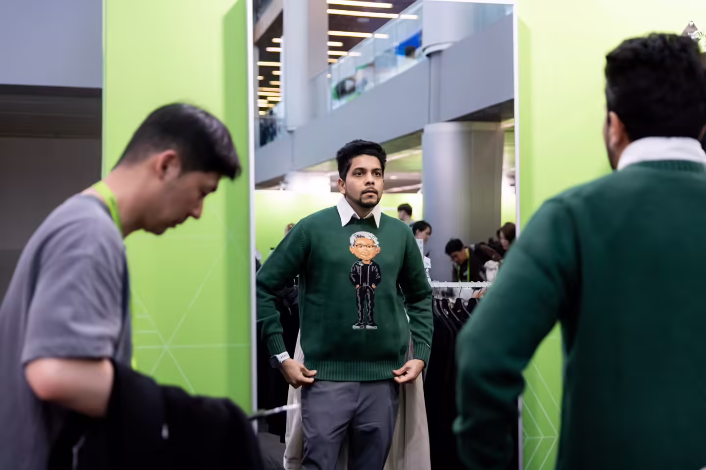 ▲ 英伟达年度大会期间,哈迪克 · 纳哈塔在纪念品店试穿了一件有黄仁勋卡通形象的毛衣