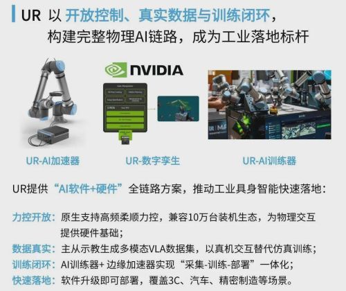 Universal Robots(优傲机器人)是Teradyne机器人旗下品牌,是全球协作机器人的开创者与领导者,全球部署量已超过10万台。在具身智能领域,UR 携手 NVIDIA、Scale AI,以“AI训练器+AI加速器”构建物理AI全链路,依托“开放力控、多模态数据采集、软硬协同、轻量化落地”四大能力,打通“数据、训练与部署”闭环,是工业具身智能规模化落地的核心标杆。