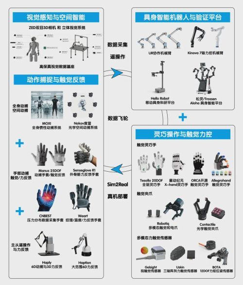 凭借在机器人与传感器领域十余年的深厚积累,公司整合全球上百种前沿硬件资源,构建了覆盖“视觉感知、动作示教、触觉力控、意图认知、灵巧操作”五大模态的模块化数据采集平台。