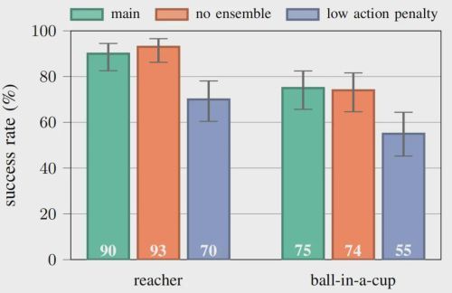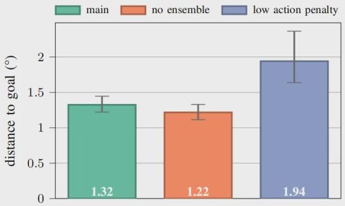 到达任务中最终关节位置与目标之间的平均绝对偏差(数值越低越好)。误差棒表示通过自助法计算的、100 次试验的 95% 置信区间。使用集成模型与不使用集成模型的最终偏差相近,而降低动作惩罚会导致偏差增大。