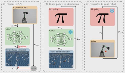 基于GeAN的肌肉机械臂Sim-to-Real流程,全程分为三个阶段,无需实机策略微调,真正实现“训练在仿真,落地在现实”。