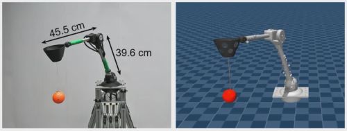 四自由度肌肉驱动机器人 PAMY2 (左侧)及其仿真模型(右侧)