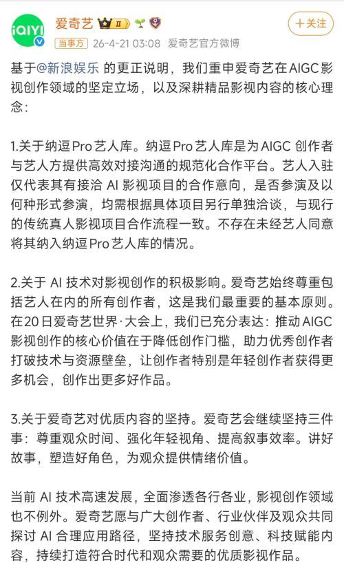 4月21日凌晨,爱奇艺发文重申,纳逗Pro艺人库是为AIGC创作者与艺人方提供高效对接沟通的规范化合作平台,不存在未经艺人同意将其纳入纳逗Pro艺人库的情况。
