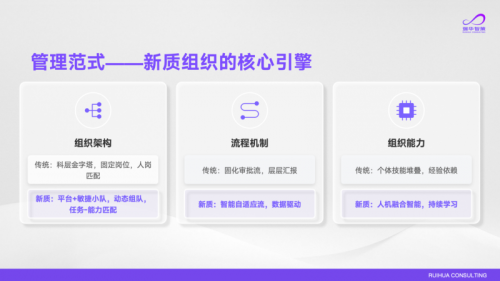 流程机制:传统组织是固化审批流、层层汇报,新质组织是智能自适应流、全链路数据驱动决策。