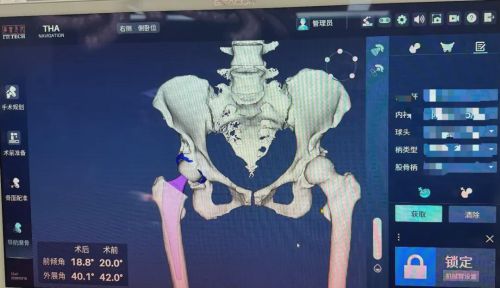 手术前,团队基于患者骨盆CT数据,在锟铻®系统中重建髋关节三维模型,清晰呈现股骨头坏死范围、髋臼形态及下肢力线异常情况。医生在虚拟空间中模拟髋臼磨锉角度、筛选假体型号、确定植入位置,提前规避解剖变异风险,为患者量身定制个体化手术方案,彻底摆脱传统手术"凭经验、靠手感"的局限。