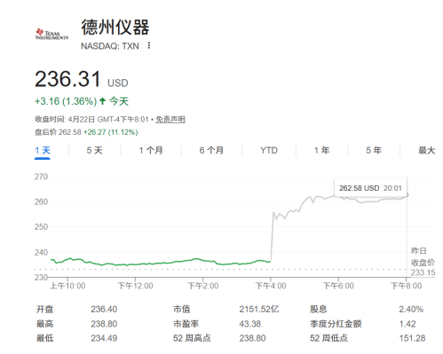 最新财报显示,德州仪器Q1营收同比增长19%至48.3亿美元,高于分析师平均预期的45.2亿美元;营业利润为18.08亿美元,同比增长37%;净利润为15.45亿美元,同比增长31%;每股收益同比增长31%至1.68美元,超过分析师平均预期的1.38美元。