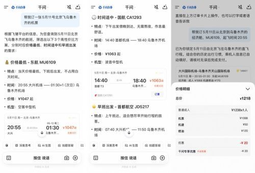 例如,用户对千问APP说“帮我订一张5月11日北京飞乌鲁木齐的机票”,它即刻理解用户意图并推荐了JD5217、CA1293、MU6109三个不同时刻起飞的航班,3张机票均显示有20元左右的“千问专享优惠”,点击具体航班卡片即可进入确认和支付环节。
