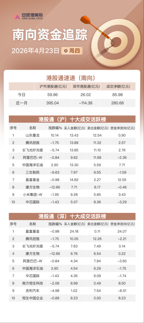 个股方面,交易所数据显示,今日南向资金