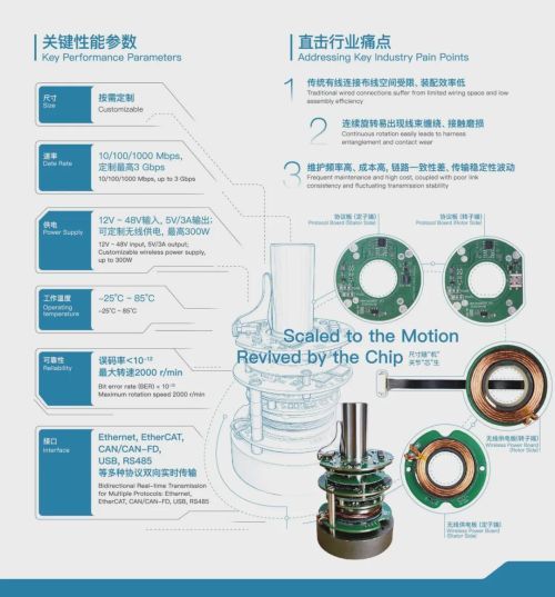 该方案支持 Ethernet、EtherCAT、CAN/CAN-FD、USB、RS485 等多种协议的双向实时传输,可适配机器人关节、灵巧手、夹爪等多类动态连接场景。通信侧支持 10 / 100 / 1000 Mbps,在定制接口与结构配置下,通信速率最高可扩展至 3 Gbps;目标误码率(BER)小于 10⁻¹²,最大转速可达 2000 r/min,工作温度范围覆盖 -25°C 至 85°C,可适配不同关节结构并支持模组化扩展。
