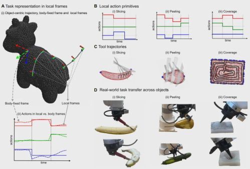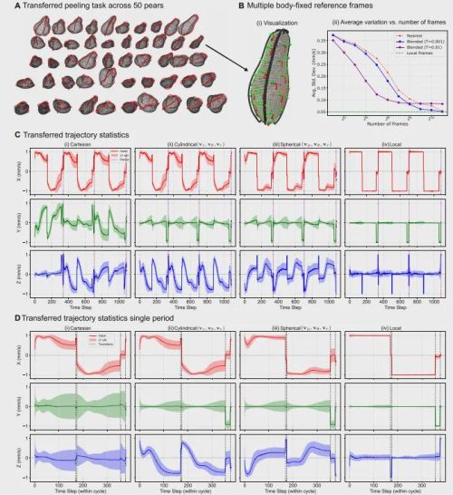 这套简单的指令是完全通用的,因为它不包含任何特定物体的形状信息。当机器人面对一根笔直的香蕉时,局部坐标系会引导它走直线;当面对一根弯曲的香蕉时,同样的指令会因为局部坐标系的自然弯曲,而自动生成贴合香蕉弧度的削皮轨迹。机器人需要学习和记忆的,不再是僵化的动作,而是一套抽象、通用的技能“配方”。