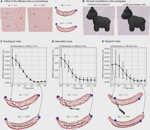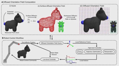 近日,一篇最新发表在国际顶级期刊Science Robotics的研究,为解决这一根本性挑战带来了曙光。研究人员们提出了一种名为“扩散方向场”(Diffused Orientation Fields)的创新方法,它为机器人打造了一套能够实时适应任何物体几何形状的“智能导航系统”,让机器人拥有了在复杂曲面物体上举一反三、触类旁通的能力。
