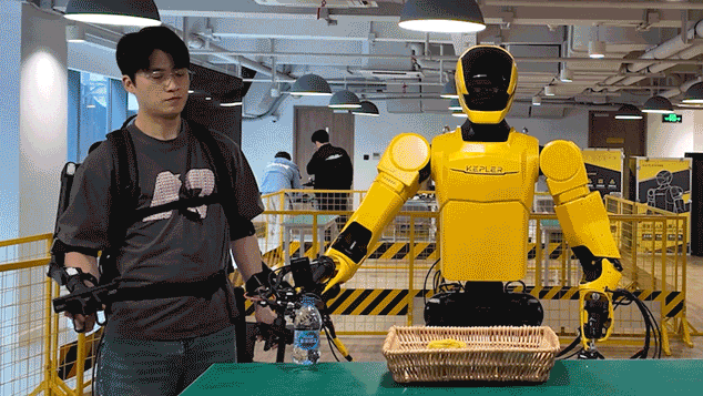 由 “同构力反馈外骨骼 + 力触反馈手部套件(夹爪 / 五指手套)+ 开普勒人形机器人(夹爪版 / 灵巧手版)”组合而成。