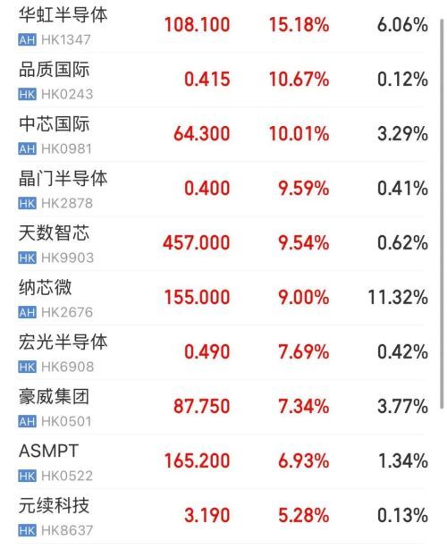 芯片股领涨,华虹半导体涨超15%,中芯国际涨10%。