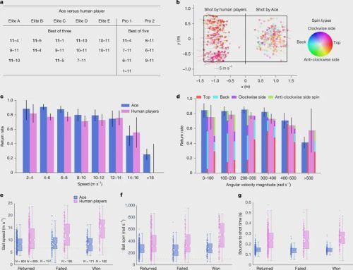 它自己打出最高速度16.4米/秒、最高旋转600弧度/秒,也能回击对手最高19.6米/秒、867弧度/秒的来球。平均回合长度5.0拍,比人类职业比赛典型值3.9拍更长。发球方面,15种不同发球直接拿下16分,精英选手仅8分。