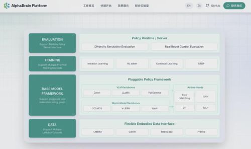 AlphaBrain Platform不仅开源自己达到世界前沿水平的三个"全球首个"(类脑、RL+VLA、世界模型),更开放地集成了其他头部模型,让开发者可以在同一平台上自由选择、组合、对比。