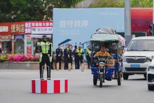 深圳某路口,一台穿着交警制服的机器人正在执勤。它能联动信号灯指挥交通,能识别非机动车闯红灯,能用标准普通话劝导行人。路过的行人有人驻足拍照,也有人绕道而行。