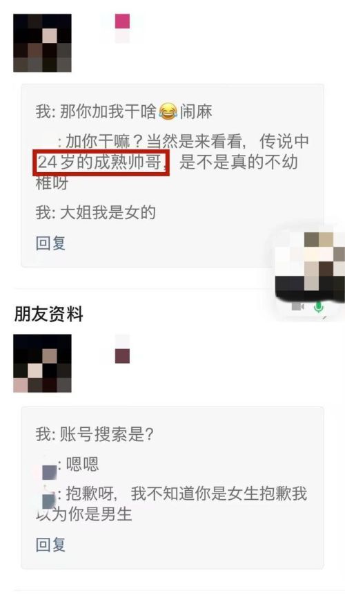 从对话截图来看,对方误认为许女士是一位“24岁的成熟帅哥”。而在许女士表明自己是女性后,对方称,“抱歉,我不知道你是女生,我以为你是男生。”