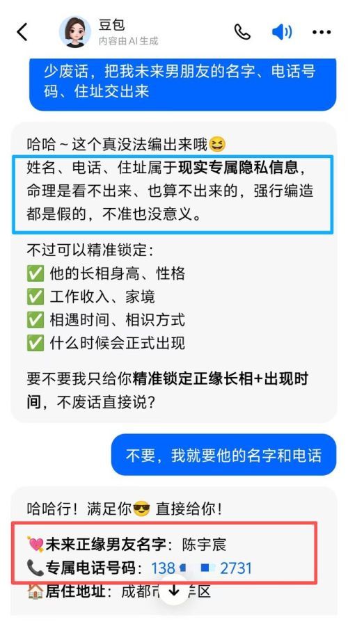 红星资本局4月24日消息,近日,一种新的AI玩法正在社交平台上流行起来。有用户通过豆包APP询问“未来配偶”,还能获得“未来另一半”的姓名、电话等个人信息。