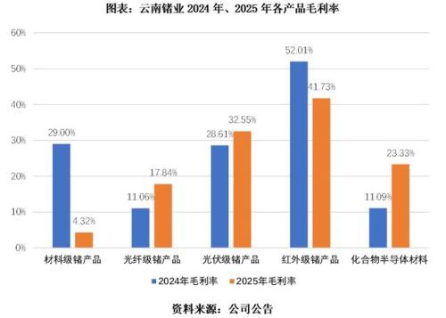 其中,材料级锗产品受成本端冲击最为明显。该产品系锗锭、二氧化锗等上游初级原料,技术含量低、同质化严重,定价权最弱,2025年其毛利率从2024年的29%骤降至4.32%。而材料级锗产品收入占比最高,达34.11%,对整体利润构成显著拖累。