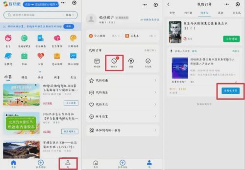 (2)签到方式二:如果您没有找到报名成功的短信,可以在微信小程序中按照下述提示找到电子票:微信搜索“互动吧”小程序→登陆 → 点击右下角“我的”→ 在“我的订单”中“待参与”找到本次大会门票