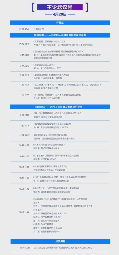 活动亮点:行业大咖分享技术前沿与产业趋势,设具身智能与人形机器人三大展区,举行LeadeRobot具身智能与人形机器人行业颁奖典礼,发布《2026具身智能与人形机器人产业报告》,开设具身智能与人形机器人产业供需对接会,举办具身智能机器人产业人才招聘会……