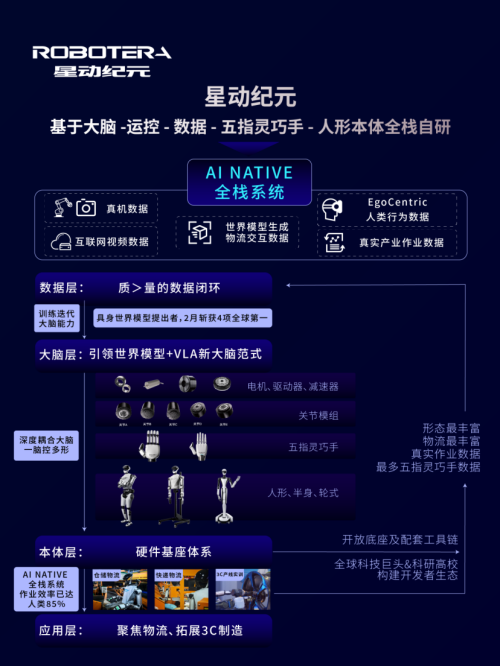 星动纪元基于大脑 -运控 - 数据 - 灵巧手 - 人形本体全栈自研,搭建完整 “真干活” 机器人AI Native系统级能力,构筑技术护城河,为产业真实落地作业、规模商业化提供落地支撑。