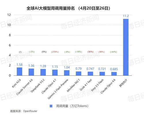 《每日经济新闻》记者注意到,上周,全球调用量排名前九中,有四款中国AI大模型。其中,Kimi K2.6位列榜首,周调用量达1.58万亿Token;DeepSeek V3.2排名第三,周调用量达1.28万亿Token;MiniMax M2.7排名第六,周调用量达0.79万亿Token,环比下滑18%。