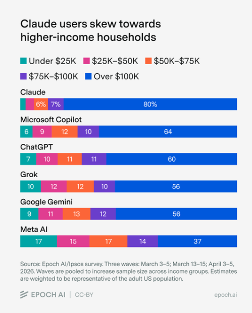 根据 Epoch AI 与 Ipsos 最新的联合调查,Anthropic 旗下的 AI 助手 Claude 在美国展现出了极其独特的用户画像。数据显示,高达 80% 的 Claude 成年用户来自年收入超过 10 万美元的家庭,这一比例在所有主流 AI 助手中位居榜首。