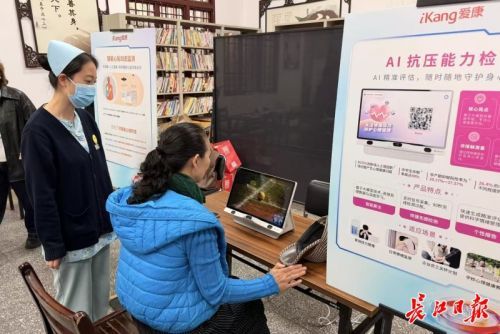 现场还设置了体重体脂检测、AI抗压能力检测等项目,无创无接触、一对一操作、报告即时可查,专家现场提供个性化健康指导。